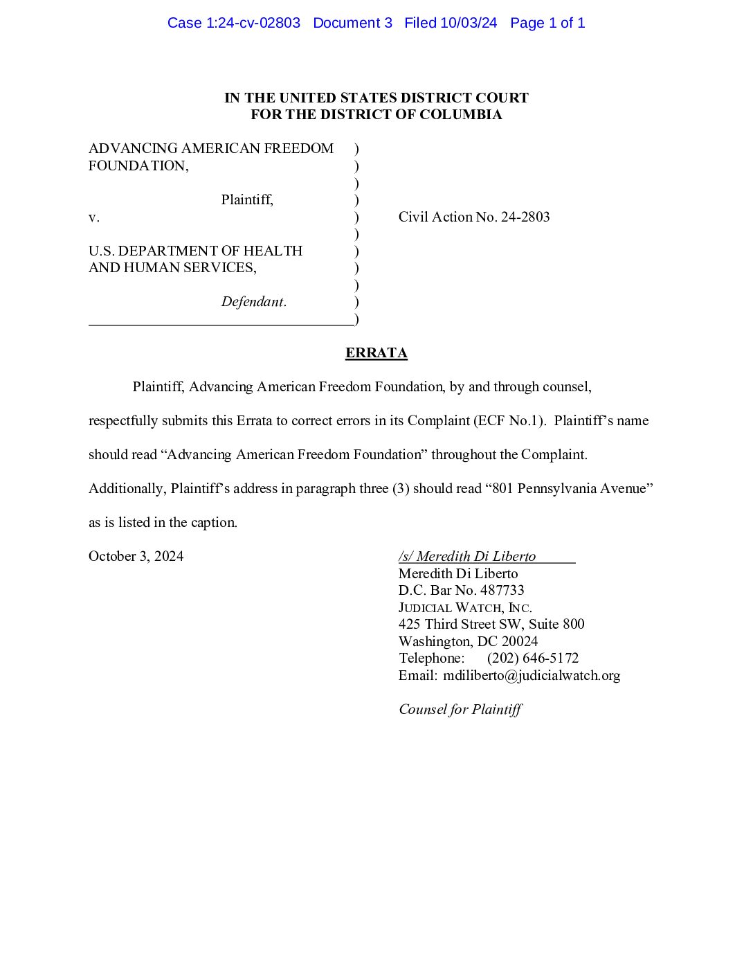 Adv Am Freedom v HHS Mifeprex complaint errata 02803