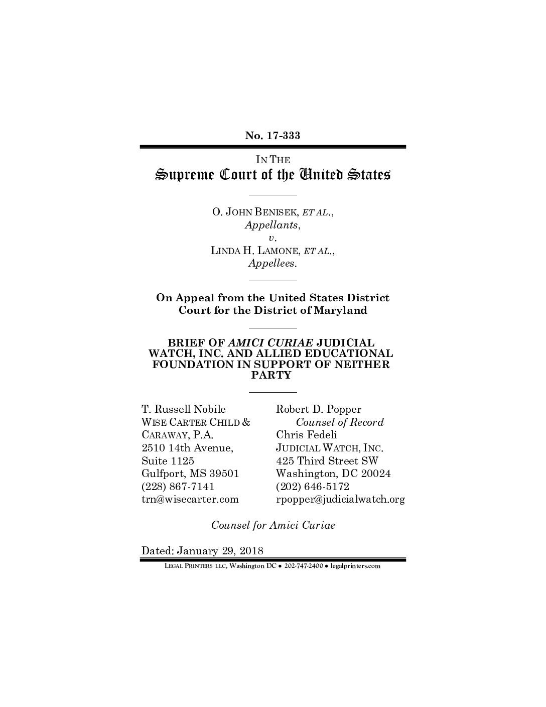 Benisek v. Lamone (JW and AEF)
