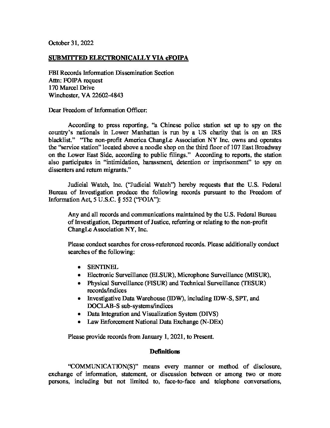 FOIA Request FBI Chinese Police Station Manhattan 10-31-2022