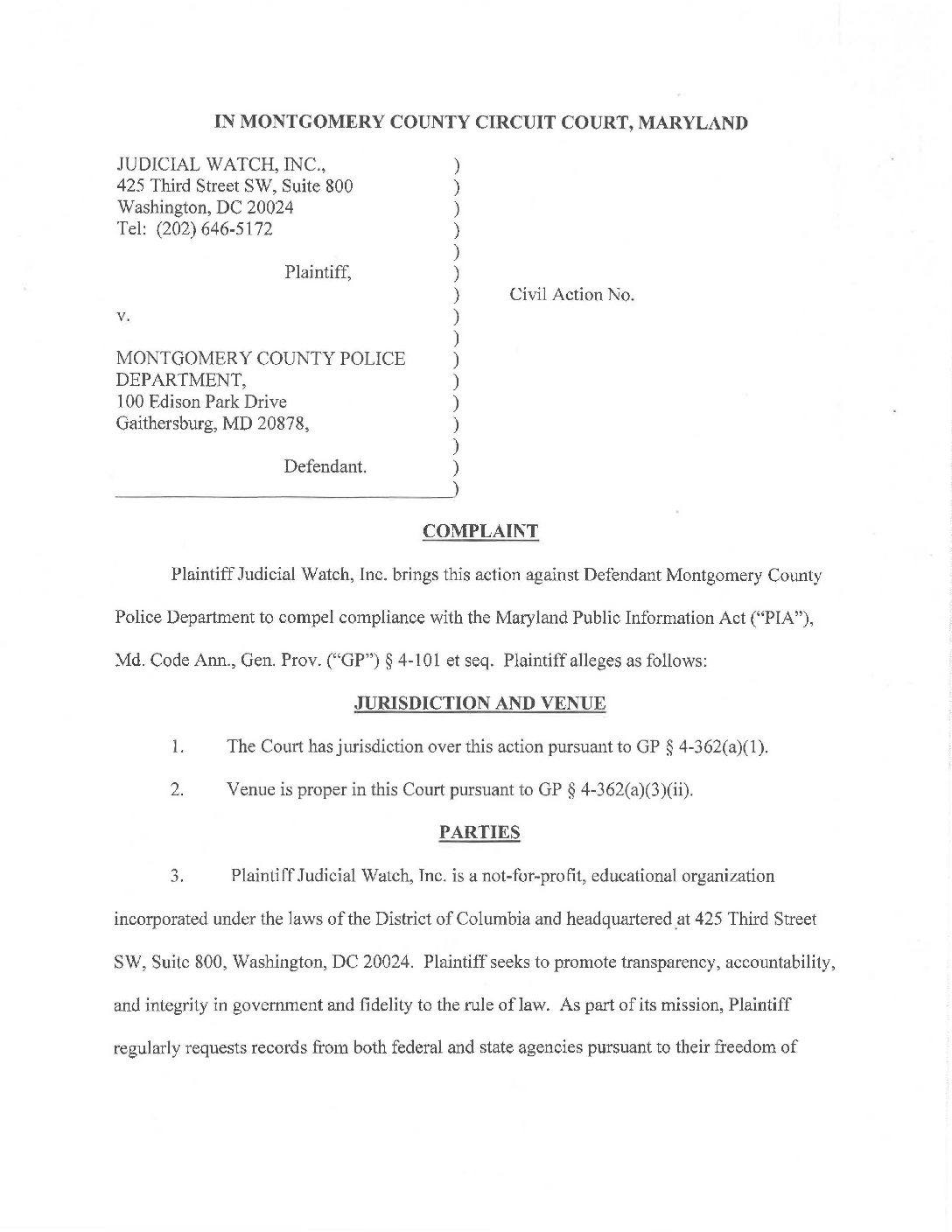 JW. v. Montgomery County Police Dep’t complaint V482964