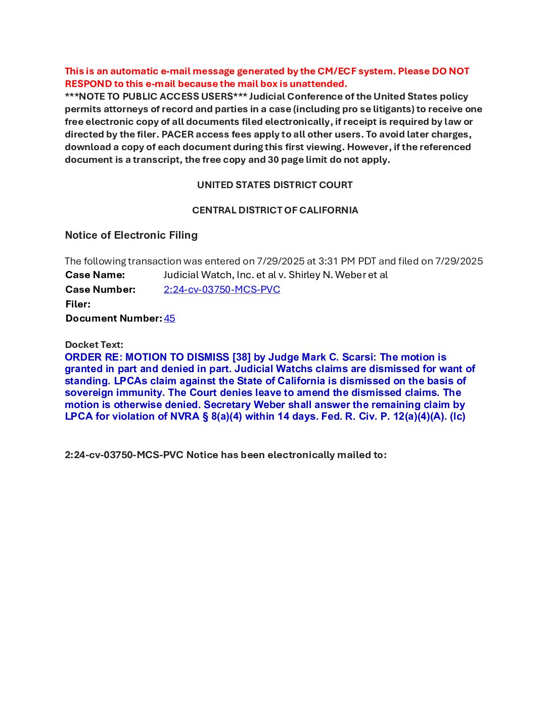 JW v Weber minute order 03750