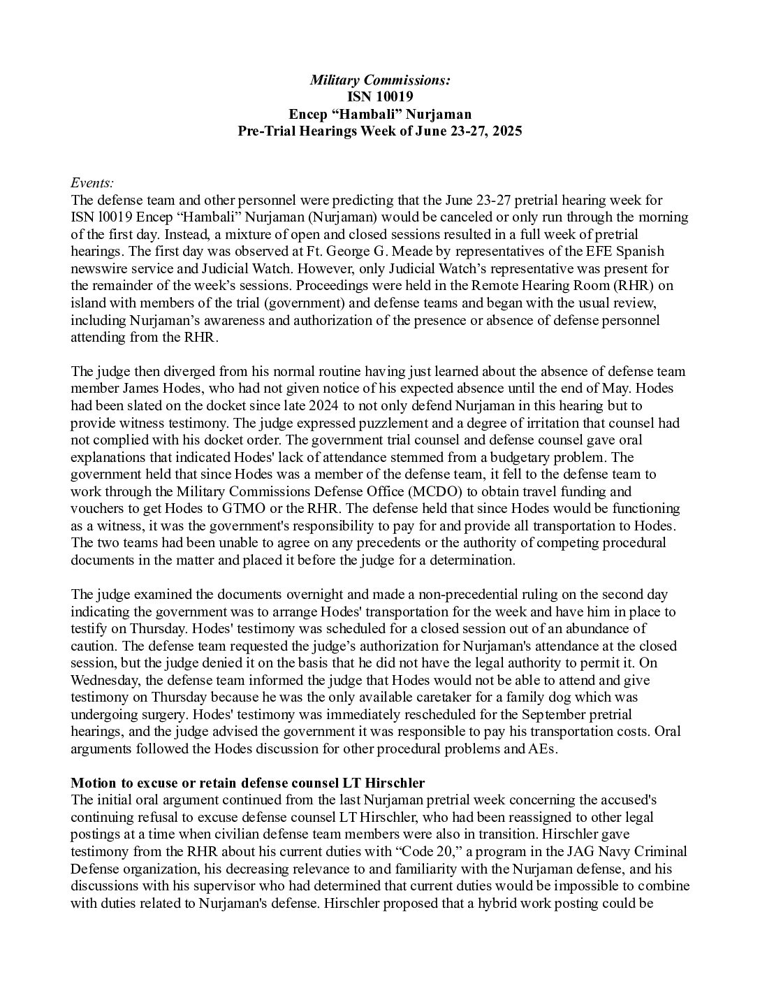 Summary of NURJAMAN Pre-Trial Hearing Week, 23-27JUN2025
